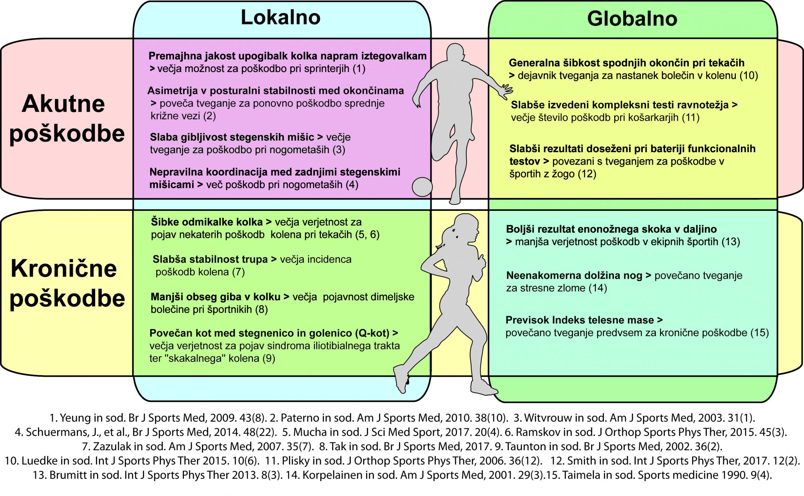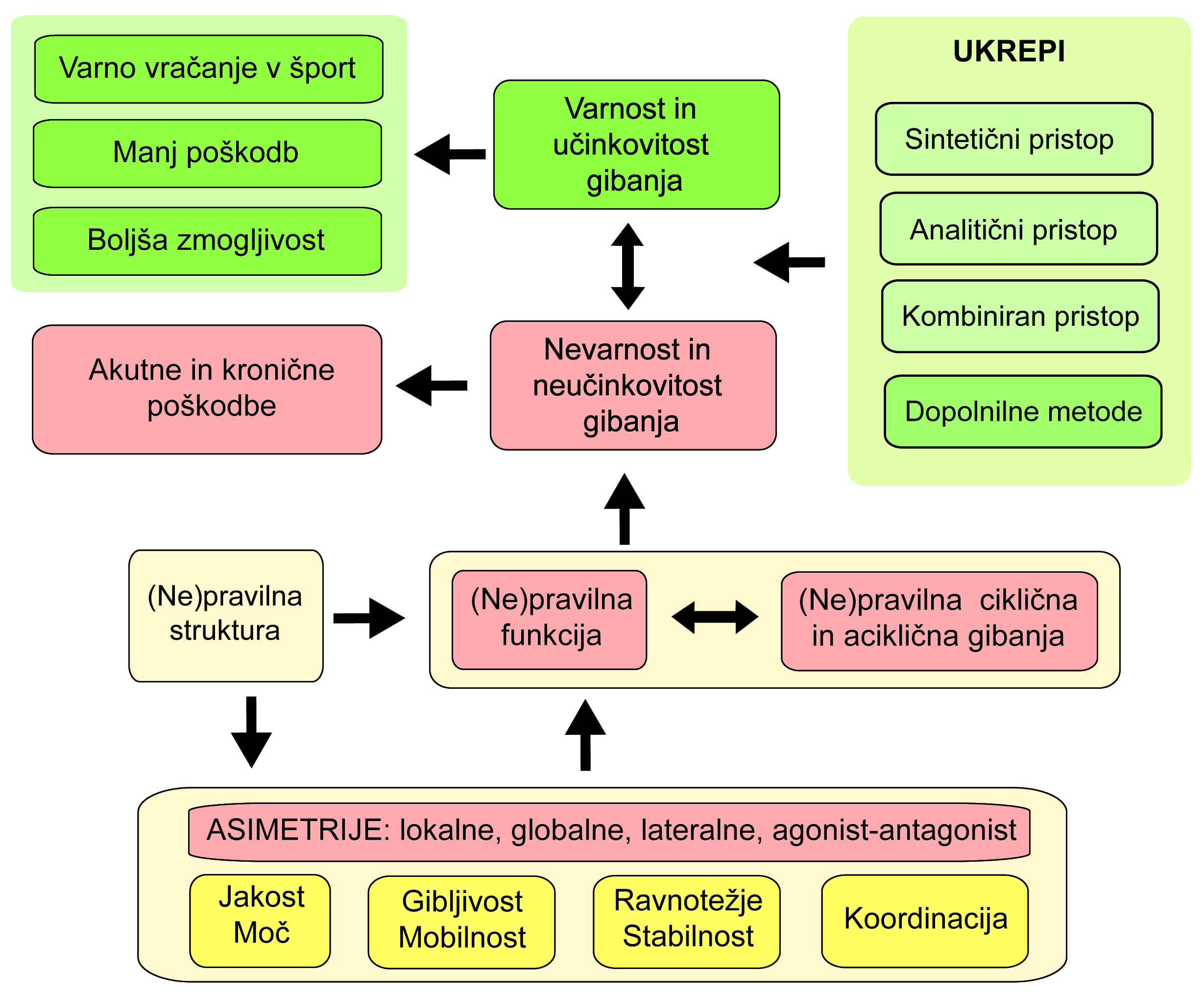 Nepravilnosti v strukturi in funkciji mišično-skeletnega sistema so bile v preteklosti že predmet raziskav kot potencialen izvor ali posledica športnih poškodb. Tozadevno je bilo v smislu gibalne zmogljivosti največ raziskovanja opravljenega na področju jakosti in moči, pri čemer so dosedanje študije preučevale tako lokalne (izolirane) asimetrije, kot tudi globalne asimetrije, ki se kažejo predvsem med izvedbo kompleksnejših gibalnih nalog. Lokalne asimetrije lahko na grobo razmejimo v asimetrije med mišicami leve in desne okončine oziroma strani telesa (lateralne asimetrije), ter asimetrije med nasprotnimi mišičnimi skupinami iste strani telesa (agonisti in antagonisti iste okončine). O globalnih asimetrijah govorimo ob prisotnosti neravnovesja v zmogljivosti večjega dela telesa oz. celotne kinetične verige. Lokalno in globalno zmogljivost pogojuje stopnja razvitosti temeljnih gibalnih sposobnosti – jakosti in moči, stabilnosti in ravnotežja ter gibljivosti ali mobilnosti, ki so v določeni meri tudi soodvisne. Tako lokalne kot globalne asimetrije v gibalnih sposobnosti pogosto vodijo v nepravilno gibalno funkcijo telesa, ki se kaže v neučinkovitem, nepravilnem in predvsem nevarnem gibanju – t.j. dejavnik tveganja za nastanek akutnih in kroničnih poškodb (Slika 1).