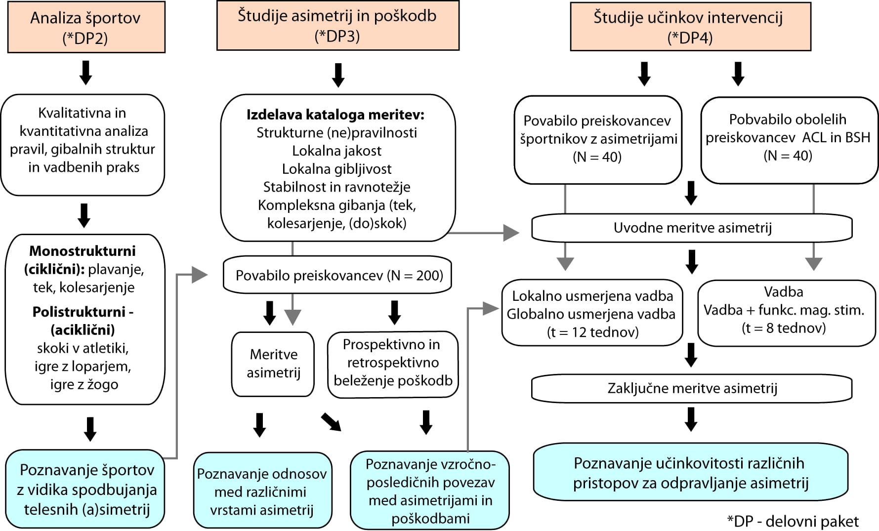 Med projektom in po njegovem izteku bomo z različnimi vprašalniki retrospektivno in prospektivno beležili prisotnost poškodb, kar nam bo odkrilo povezanosti različnih asimetrij in tveganjem za poškodbo. Vključujemo športnike iz različnih disciplin – nogometa, košarke, odbojke, borilnih veščin, teka in drugih. Drugi del projekta predstavljajo intervencijske študije, s katerimi bomo preverili učinke različnih gibalno-terapevtskih pristopov za odpravljanje asimetrij. Na ta način bomo preučili tako povezanost asimetrij in poškodb, kot tudi načine za odpravo. Podrobneje je načrt dela predstavljen na diagramu delovnih sklopov.